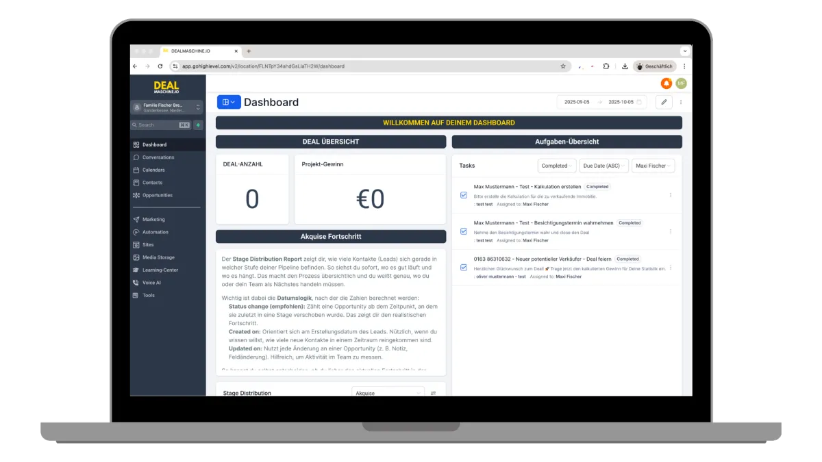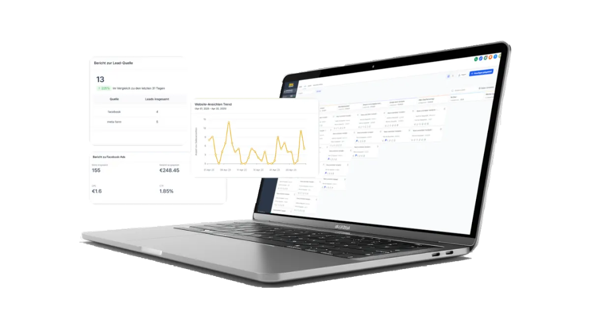 Du siehst jederzeit, wo welcher Deal steht, wer woran arbeitet, welche Aufgaben noch offen sind und woher Deine Leads überhaupt kommen – so gewinnst Du endlich den vollen Überblick über Dein Immobilienunternehmen.